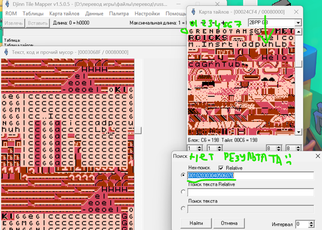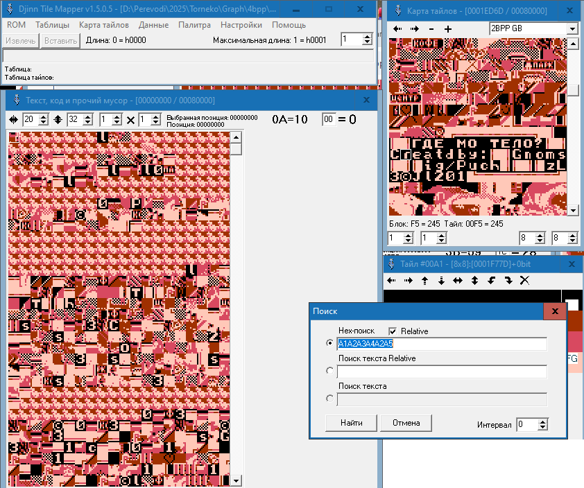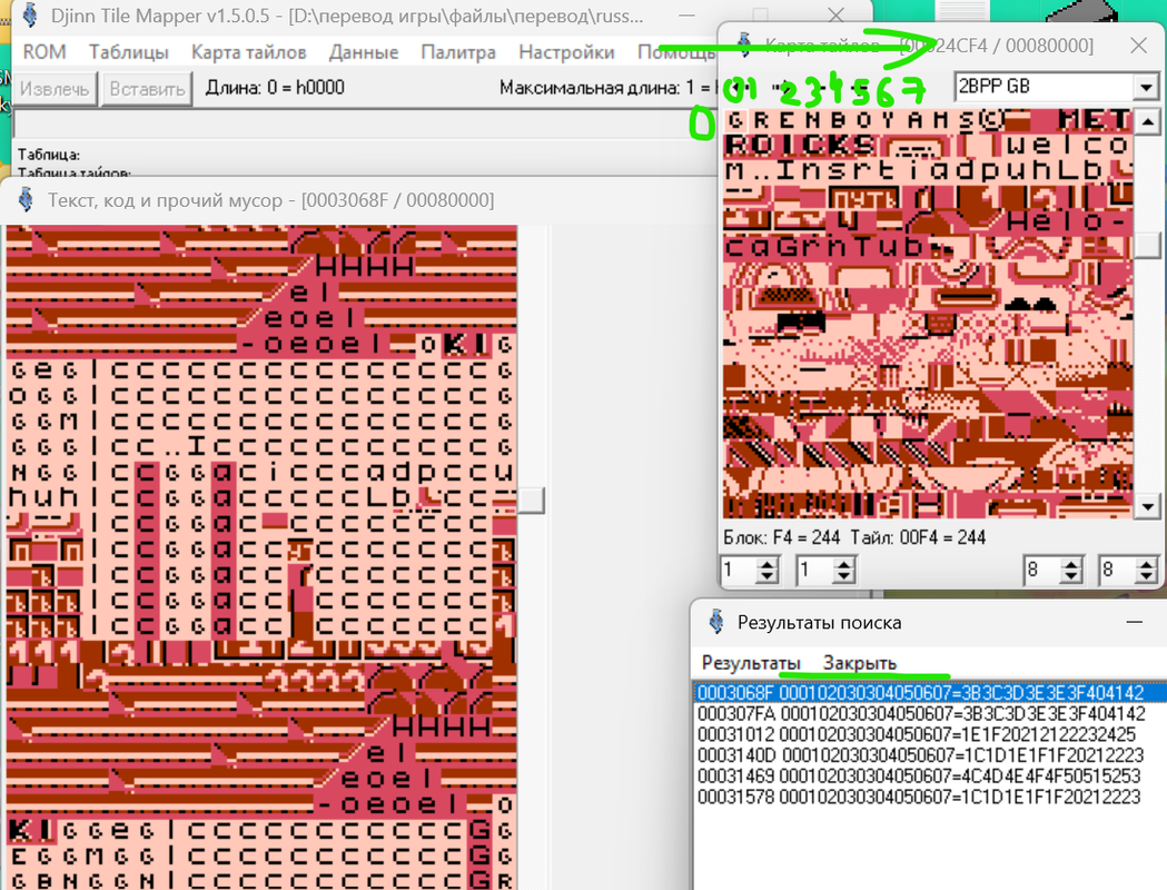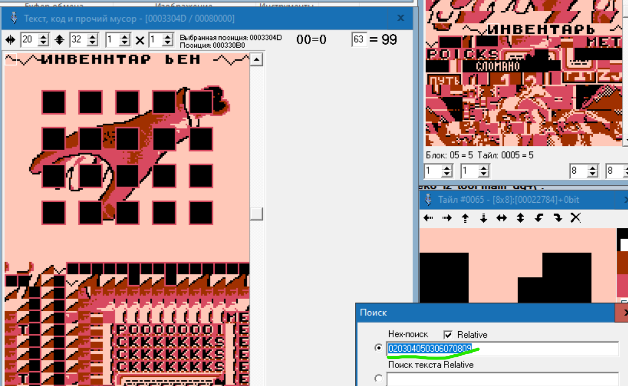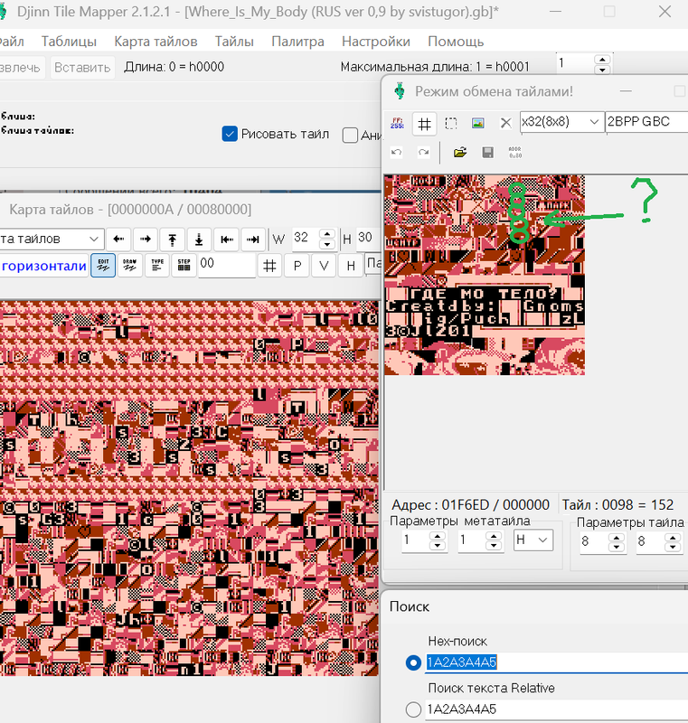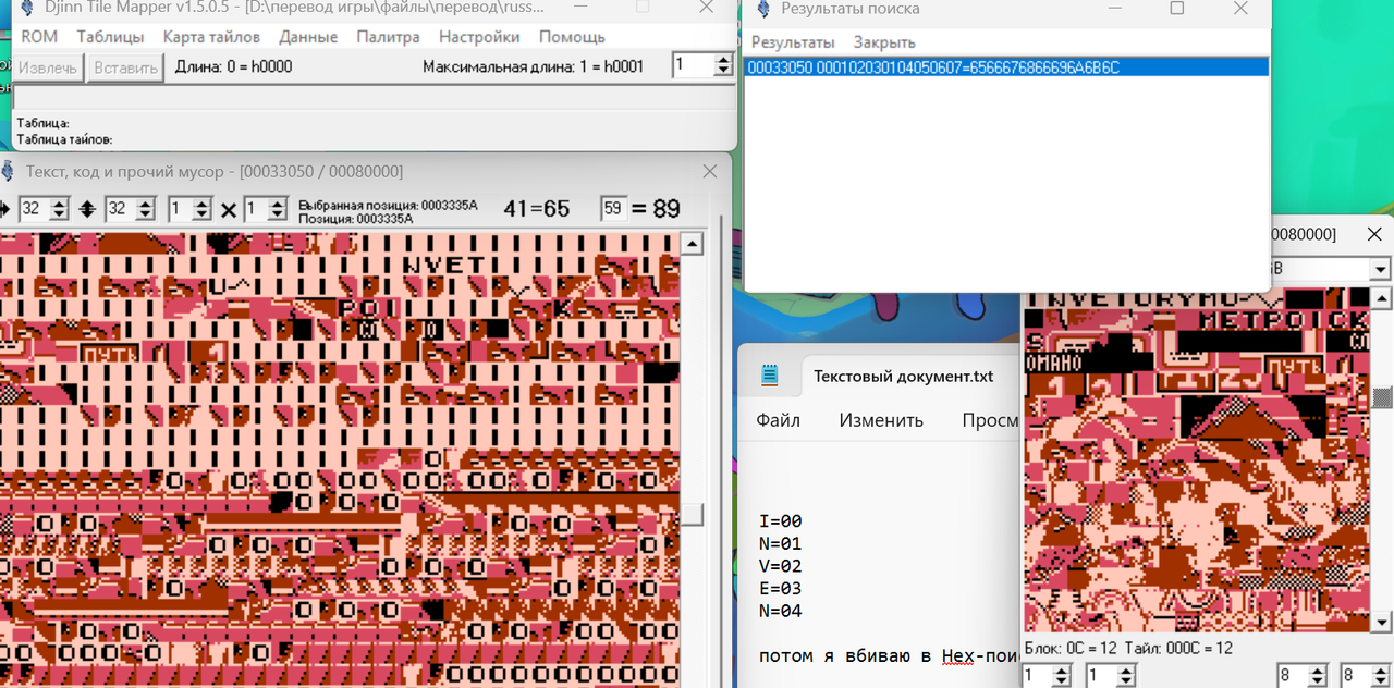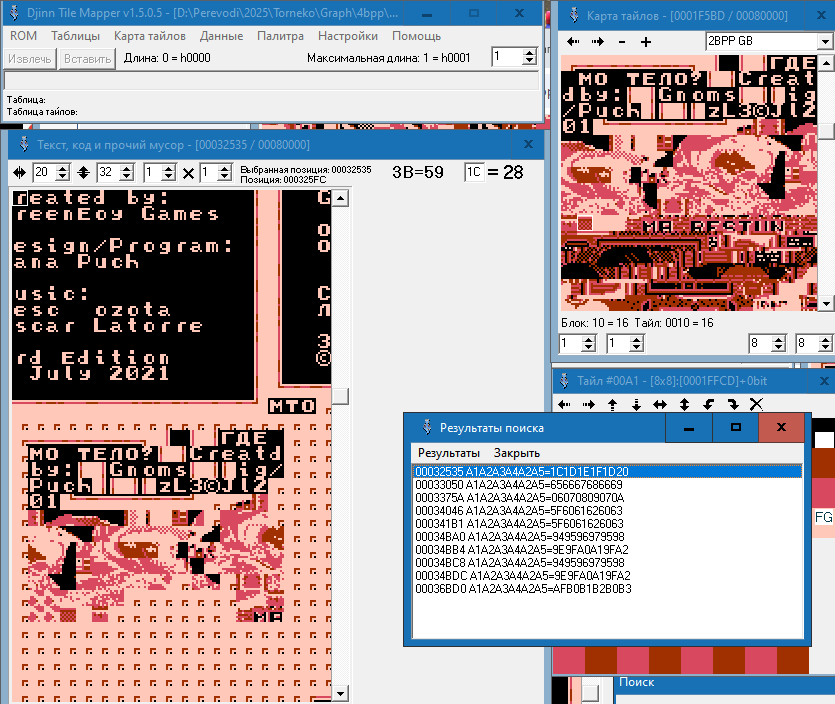Я обнаружил, что титульный текст написан исключительно графикой. Но вот проблема. В редакторе тайлов я текст, из которых состоят титры, вижу. А найти комбинацию этих тайлов-букв в виде слов в "код, текст и прочий мусор" не могу. Всё делал по гайду, который записывал Зелёный. И просто тыкался по коду, но ничего не выходит. Подскажите, пожалуйста, как найти титульник?