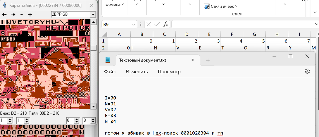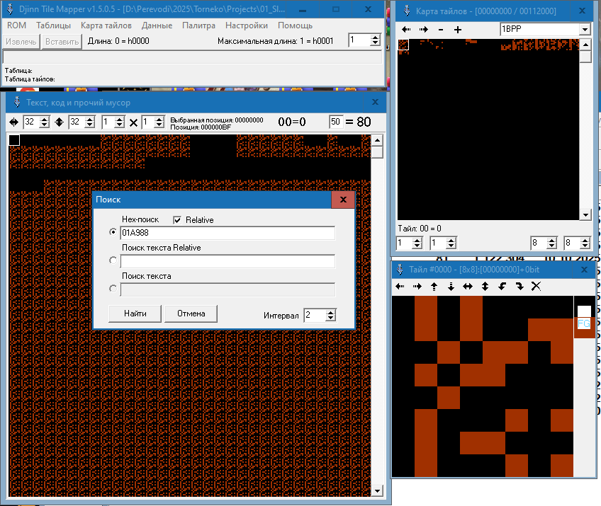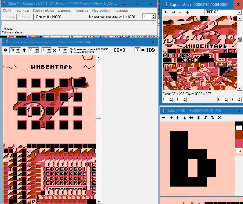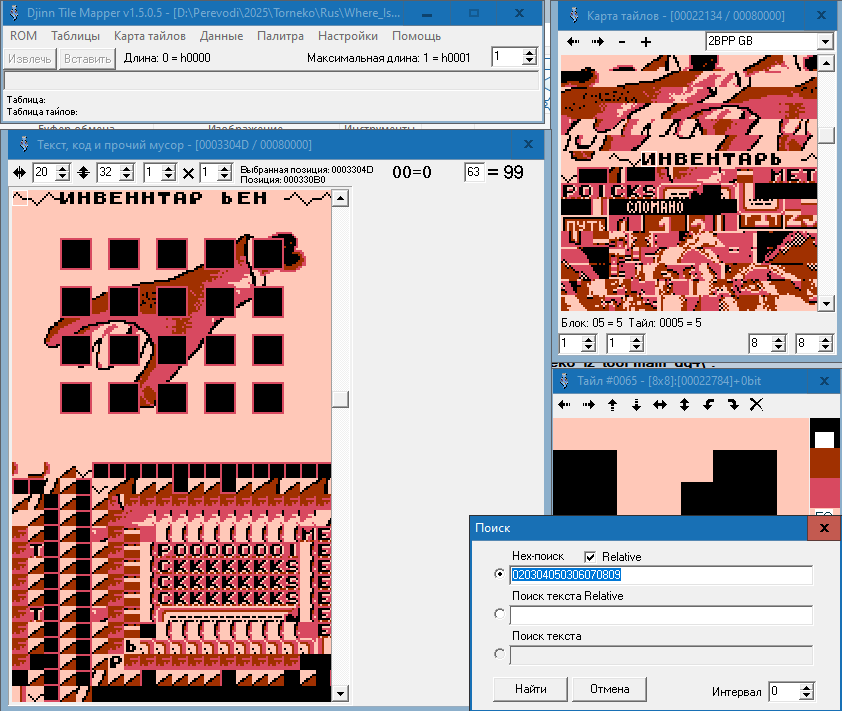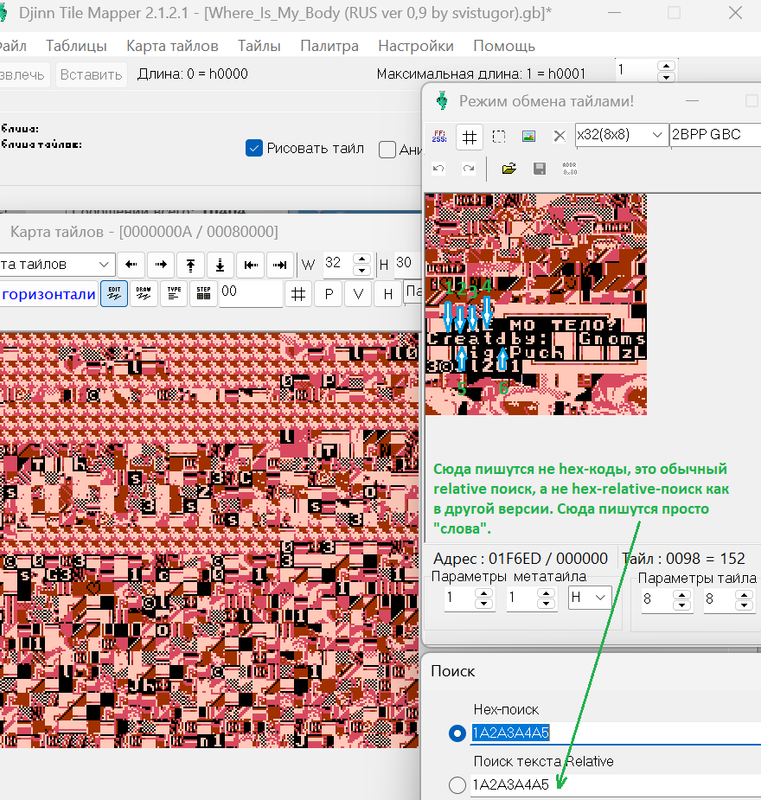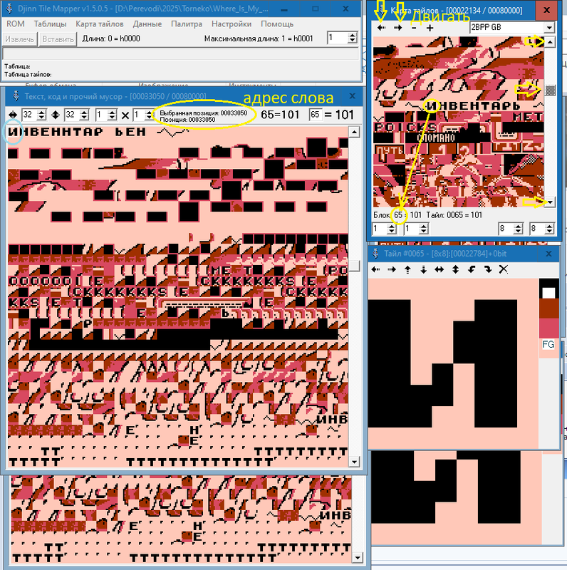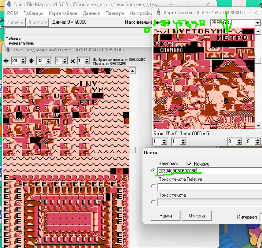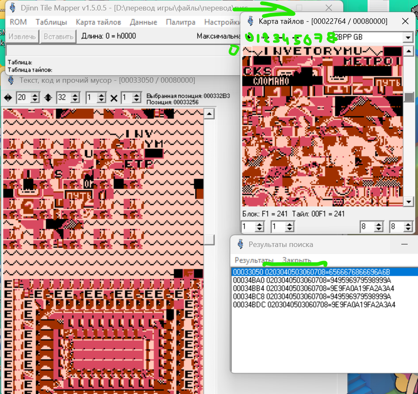 Я обнаружил, что титульный текст написан исключительно графикой. Но вот проблема. В редакторе тайлов я текст, из которых состоят титры, вижу. А найти комбинацию этих тайлов-букв в виде слов в "код, текст и прочий мусор" не могу. Всё делал по гайду, который записывал Зелёный. И просто тыкался по коду, но ничего не выходит. Подскажите, пожалуйста, как найти титульник?